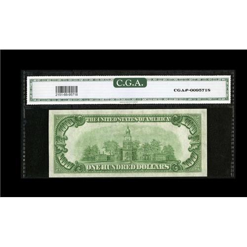 <B>Fr. 2151-G $100 1928A Federal Reserve Note. CGA Gem Uncirculated 66.</B></I><BR>Another clean example from this mini-run of tougher Chicago $100 notes.