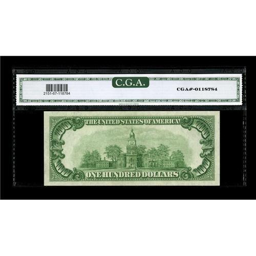<B>Fr. 2151-G $100 1928A Federal Reserve Note. CGA Gem Uncirculated 67.</B></I><BR>A very high grade example of this underrated early FRN series. The ink colors are robust and the paper surfaces fresh and bright.<BR><BR><b>Shipping:</b> Coins & Currency (<a target="_blank" href="http://www.heritageauctions.com/common/shipping.php">view shipping information</a>)