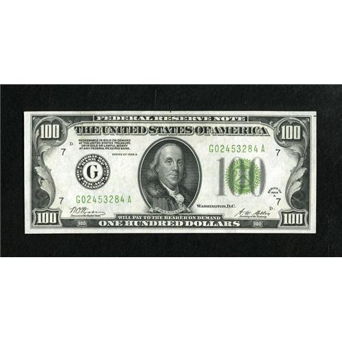 <B>Fr. 2151-G $100 1928A Federal Reserve Note. Crisp Uncirculated.</B></I><BR>A touch of handling is noticed at left.<BR><BR><b>Shipping:</b> Coins & Currency (<a target="_blank" href="http://www.heritageauctions.com/common/shipping.php">view shipping information</a>)