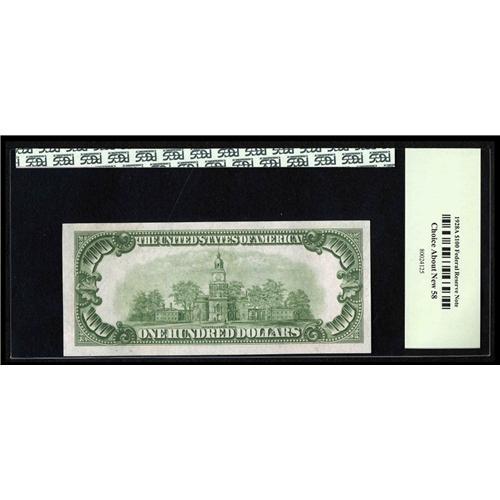 <B>Fr. 2151-G $100 1928A Federal Reserve Note. PCGS Choice About New 58.</B></I><BR>This DGS variety appears to have a light center bend through the holder.