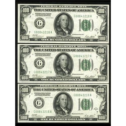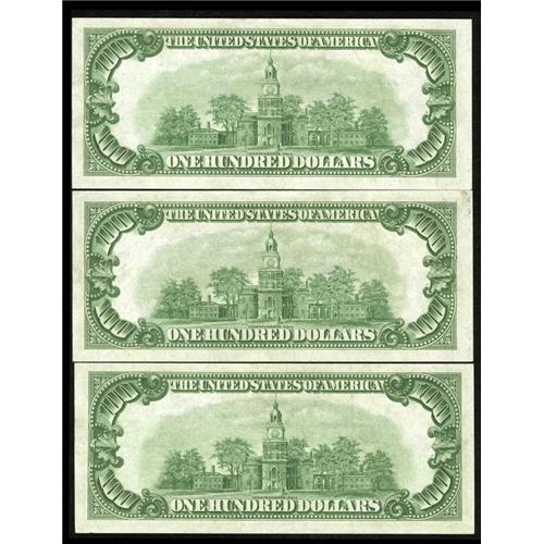 <B>Fr. 2151-G $100 1928A Federal Reserve Notes. Extremely Fine-About Uncirculated.</B></I><BR>A run of three consecutive notes, all of which bear only the lightest evidence of circulation.