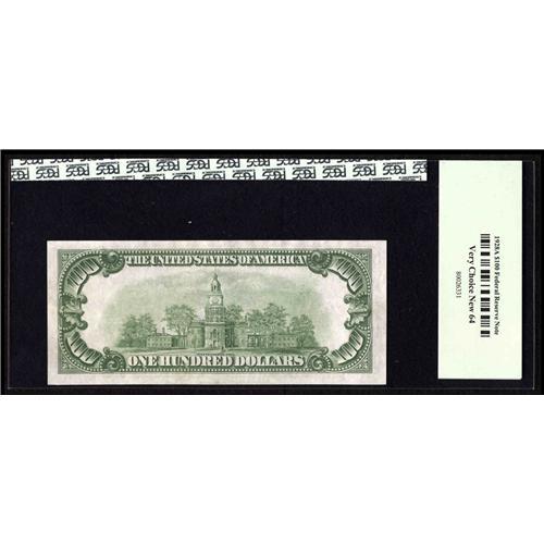 <B>Fr. 2151-H* $100 1928A Federal Reserve Note. PCGS Very Choice New 64.</B></I><BR>This note from the New England Changeover collection came from the 2004 Memphis auction, where it was described as follows: "Only half of the 12 districts issued light green seal 1928-A FRNs and only the St. Louis district is known to have issued star notes. Until now, only a single serial number was recorded. This note is 1,763 numbers lower and is brand new. Records show that 24,000 were printed, but, as is so often the case, printings are not known notes but just an indication because they could always be destroyed or never used. The note offered here is well centered, fresh and bright but it does have some faint handling....A classic small size rarity awaiting a serious collector. Choice CU." It realized $14,950 in that sale, and should easily reach or exceed that level tonight. It has now been encapsulated by PCGS as very choice. An important rarity for the connoisseur.