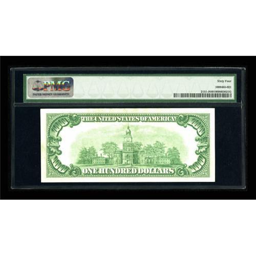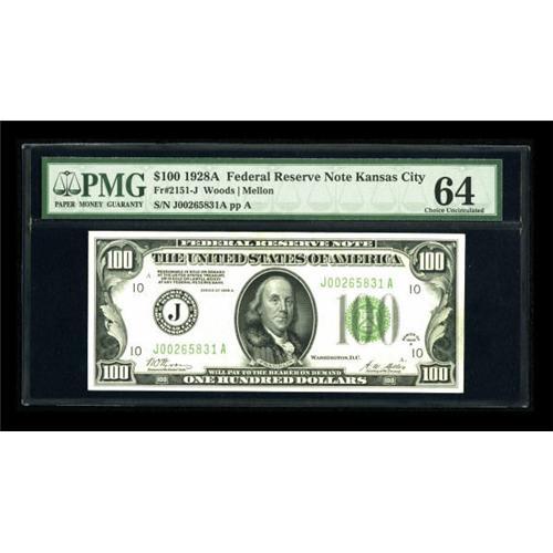 <B>Fr. 2151-J $100 1928A Federal Reserve Note. PMG Choice Uncirculated 64.</B></I><BR> This note exhibits vivid color.<BR><BR><b>Shipping:</b> Coins & Currency (<a target="_blank" href="http://www.heritageauctions.com/common/shipping.php">view shipping information</a>)