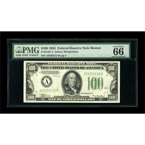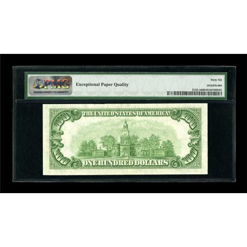 <B>Fr. 2152-A $100 1934 Federal Reserve Note. PMG Gem Uncirculated 66 EPQ.</B></I><BR> Margins this big are an uncommon feature for this issue. Nicely centered with plenty of eye appeal.<BR><BR><b>Shipping:</b> Coins & Currency (<a target="_blank" href="http://www.heritageauctions.com/common/shipping.php">view shipping information</a>)