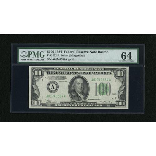 <B>Fr. 2152-A $100 1934 Federal Reserve Note. PMG Choice Uncirculated 64.</B></I><BR> A pleasing Boston note with plenty of embossing.<BR><BR><b>Shipping:</b> Coins & Currency (<a target="_blank" href="http://www.heritageauctions.com/common/shipping.php">view shipping information</a>)