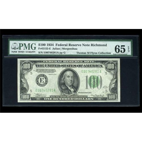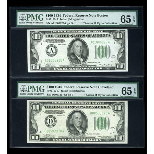 <B>Fr. 2152-A $100 1934 Federal Reserve Note. PMG Gem Uncirculated 65 EPQ.<BR>Fr. 2152-D $100 1934 Federal Reserve Note. PMG Gem Uncirculated 65 EPQ.<BR>Fr. 2152-E $100 1934 Federal Reserve Note. PMG Gem Uncirculated 65 EPQ.</B></I><BR> Three Gem 65 EPQ examples from the 1934 series, with all three pieces well centered and attractive. <BR><I>From The Thomas M. Flynn Collection</B></I><BR><BR><b>Shipping:</b> Coins & Currency (<a target="_blank" href="http://www.heritageauctions.com/common/shipping.php">view shipping information</a>)