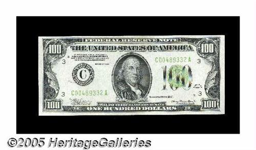<B>Fr. 2152-C $100 1934 Light Green Seal Federal Reserve Note. Choice Crisp Uncirculated.</B></I><BR>The Oakes catalog value of $600 in CU should be considered the starting point for serious bidding on this attractive Philadelphia $100.
