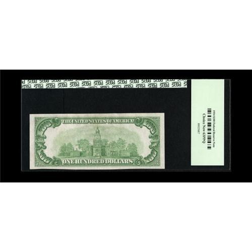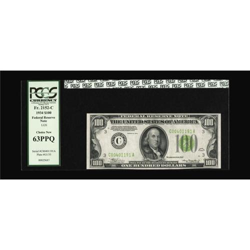 <B>Fr. 2152-C $100 1934 Light Green Seal Federal Reserve Note. PCGS Choice New 63PPQ.</B></I><BR>The Oakes-Schwartz catalog value of $500 in CU should be considered a mere starting point for this PPQ example.