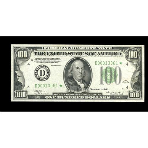 <B>Fr. 2152-D* $100 1934 Federal Reserve Note. Choice Crisp Uncirculated.</B></I><BR>The Oakes catalogue considers Cleveland the second scarcest district for stars in this series, with a catalogue valuation of $1800 in CU.