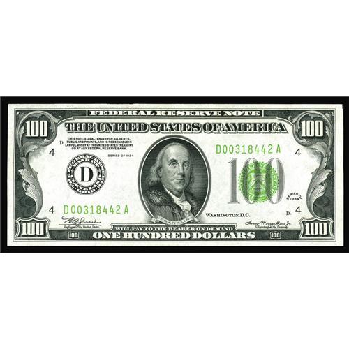 <B>Fr. 2152-D $100 1934 Federal Reserve Note. Gem Crisp Uncirculated.</B></I><BR>A crackling fresh and well centered $100 1934 FRN.