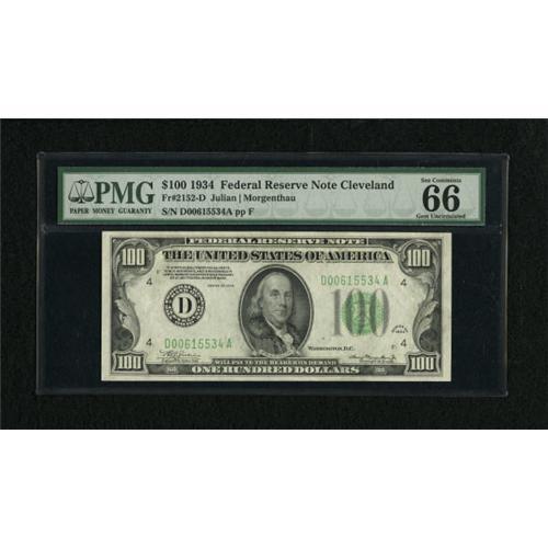 <B>Fr. 2152-D $100 1934 Federal Reserve Note. PMG Gem Uncirculated 66 EPQ.</B></I><BR> A pleasing Cleveland C-note that is widely margined and strongly embossed.<BR><BR><b>Shipping:</b> Coins & Currency (<a target="_blank" href="http://www.heritageauctions.com/common/shipping.php">view shipping information</a>)