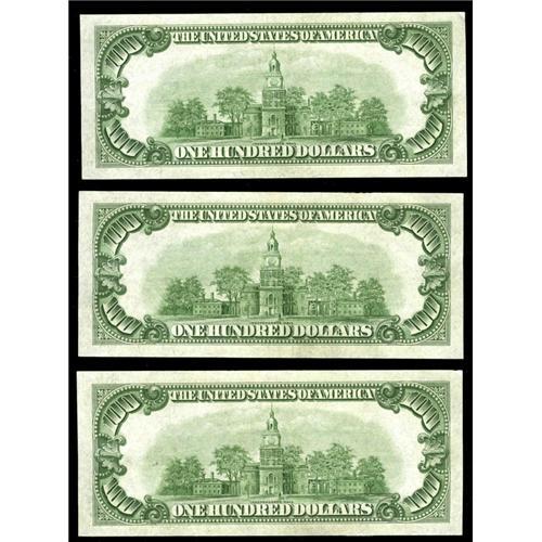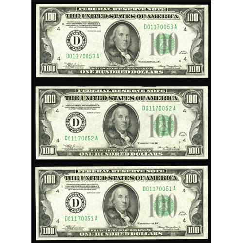 <B>Fr. 2152-D $100 1934 Federal Reserve Notes. Gem Crisp Uncirculated.</B></I><BR>A run of three consecutive notes retaining all their original snap and crispness. The $300 catalog for this denomination and series in the Oakes-Schwartz reference seems just about right.