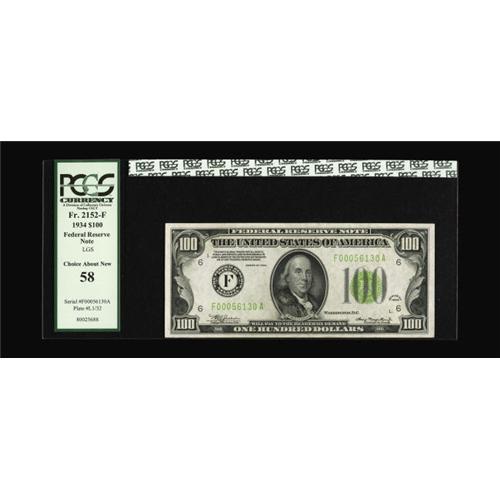 <B>Fr. 2152-F $100 1934 Light Green Seal Federal Reserve Note. PCGS Choice About New 58.</B></I><BR>The encapsulation surfaces effectively obscure whatever factor caused this note to be certified as a 58 rather than one of the uncirculated grades. It is bright and well centered.