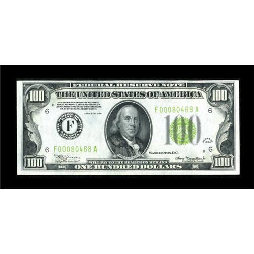<B>Fr. 2152-F $100 Light Green Seal 1934 Federal Reserve Note. Very Choice Crisp Uncirculated.</B></I><BR> A lovely Light Green Seal example with loads of embossing evident. <BR><I>From The Thomas M. Flynn Collection</B></I><BR><BR><b>Shipping:</b> Coins & Currency (<a target="_blank" href="http://www.heritageauctions.com/common/shipping.php">view shipping information</a>)