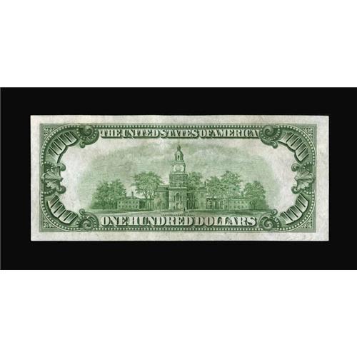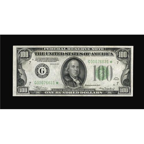 <B>Fr. 2152-G* $100 1934 Federal Reserve Note. About Uncirculated.</B></I><BR>This pleasing star has a light bend at center but appears fully Uncirculated. The overprint is bright and the margins are sizeable.<BR><BR><b>Shipping:</b> Coins & Currency (<a target="_blank" href="http://www.heritageauctions.com/common/shipping.php">view shipping information</a>)