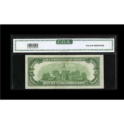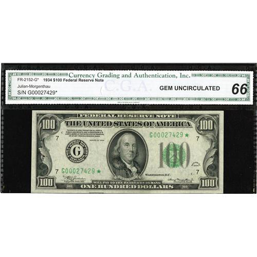 <B>Fr. 2152-G* $100 1934 Federal Reserve Note. CGA Gem Uncirculated 66.</B></I><BR>A captivatingly scarce star in superlative condition. The margins are well balanced and even, and the note overall presents itself beautifully.