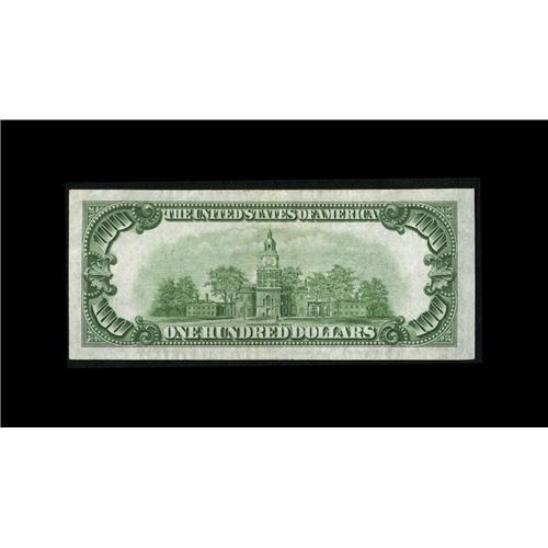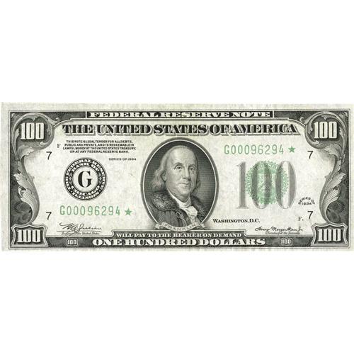 <B>Fr. 2152-G* $100 1934 Federal Reserve Note. Choice About Uncirculated.</B></I><BR>A corner fold can be seen under close inspection on this crisp early replacement note.