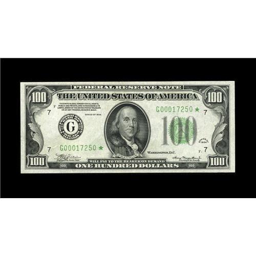 <B>Fr. 2152-G* $100 1934 Federal Reserve Note. Choice Crisp Uncirculated.</B></I><BR>Ample margins are found on this attractive star.<BR><I>From The Bill and Kathy Stella Currency Collection</B></I><BR><BR><b>Shipping:</b> Coin/Currency (<a target="_blank" href="http://www.heritageauctions.com/common/shipping.php">view shipping information</a>)