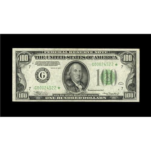 <B>Fr. 2152-G* $100 1934 Federal Reserve Note. Extremely Fine-About Uncirculated.</B></I><BR>Just a little handling is found on this $100.<BR><I>From The Bill and Kathy Stella Currency Collection</B></I><BR><BR><b>Shipping:</b> Coin/Currency (<a target="_blank" href="http://www.heritageauctions.com/common/shipping.php">view shipping information</a>)