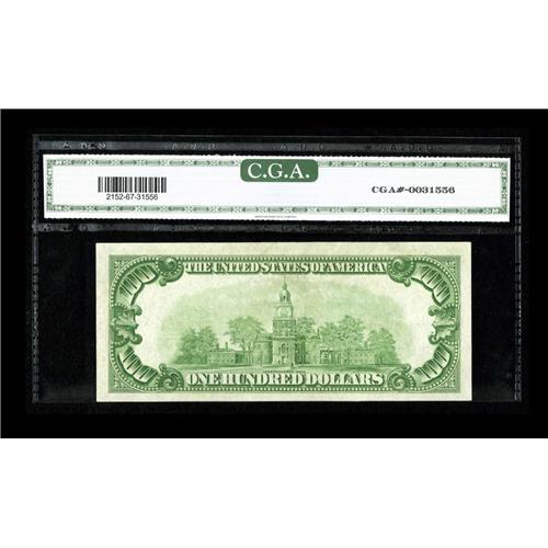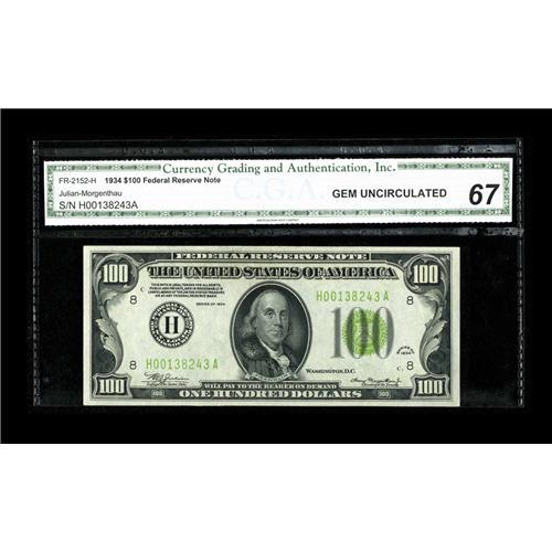 <B>Fr. 2152-H $100 1934 LGS Federal Reserve Note. CGA Gem Uncirculated 67.</B></I><BR>Solid margins are noted all around this Light Green Seal issue.<BR><BR><b>Shipping:</b> Coin/Currency (<a target="_blank" href="http://www.heritageauctions.com/common/shipping.php">view shipping information</a>)