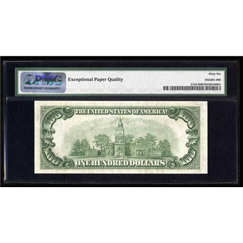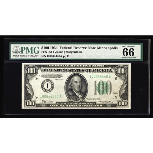 <B>Fr. 2152-I $100 1934 Federal Reserve Note. PMG Gem Uncirculated 66.</B></I><BR>The certification service adds the additional comment: "Exceptional paper quality," an observation we find ourselves in accord with.