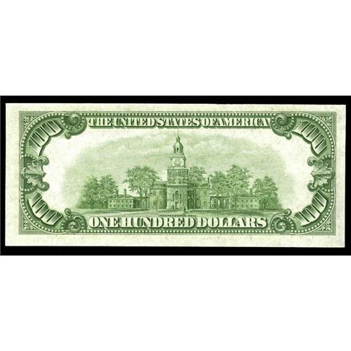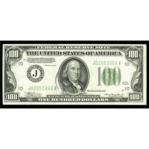 <B>Fr. 2152-J $100 1934 Federal Reserve Note. Choice Crisp Uncirculated.</B></I><BR>Here is a new high serial number by a wide margin for the Oakes tome. Embossing is noticed on this KC $100 that has a partial black ring from a teller stamp just to the left of the portrait.