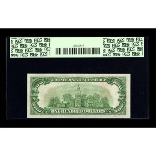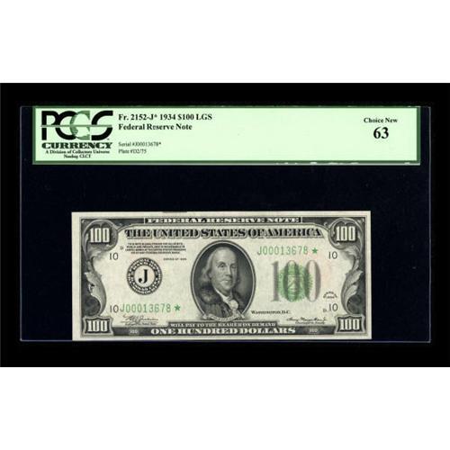 <B>Fr. 2152-J* $100 1934 Federal Reserve Note. PCGS Choice New 63.</B></I><BR> A nice star example with excellent color and eye appeal. The margins are sizeable, though not quite even enough for a Gem grade.<BR><BR><b>Shipping:</b> Coins & Currency (<a target="_blank" href="http://www.heritageauctions.com/common/shipping.php">view shipping information</a>)