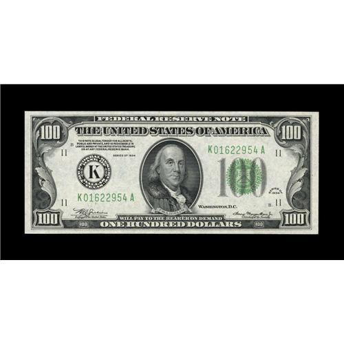 <B>Fr. 2152-K $100 1934 DGS Federal Reserve Note. Gem Crisp Uncirculated.</B></I><BR>A perfectly centered Gem with great eye appeal and outstanding paper quality.<BR><BR><b>Shipping:</b> Coin/Currency (<a target="_blank" href="http://www.heritageauctions.com/common/shipping.php">view shipping information</a>)