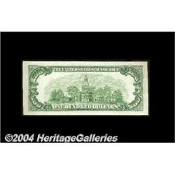 Fr. 2152-K $100 1934 Federal Reserve Note. Choice About Uncirculated.A couple of well hidden corner folds from gem. <BR><BR><B>Important notice:</B> Heritage usually auctions material at the rate of 200-250 lots per hour. On some occasions eBay Live bid software or the Internet may not be able to keep up with the pace of the auction. We recommend placing a realistic absentee bid now as insurance to avoid disappointment. Occasionally the auctioneer may eliminate or reject an eBay Live bid, and the auctioneer may also reopen a lot after the close of the eBay live bidding (usually because we missed an audience bid), and may reject your bid even if it shows you as the winning bidder. By bidding via eBay Live, you agree that Heritage may award the lot to another bidder at its sole discretion under the circumstances described above or any other reasonable circumstances. Since eBay bids are not shown to us until we open the lot on the floor, we treat those bids just like floor bids. In most cases the floor responds before the eBay bid is presented to us, due to Internet lag time, so for consistency we have made it a policy that floor bids are always considered first over tie eBay live bids. Also please note that all Heritage lots purchased through eBay Live carry a 20% Buyer's Premium. Please make sure you read the Terms and Conditions before you bid. <BR><BR><B>IMPORTANT ANNOUNCEMENT ABOUT RESERVES:</B> Heritage now divulges all reserves on its web site 7 days before every auction. If you want to know whether the reserve on this lot has been met, and if not, what the reserve amount is, please visit this lot page on the HeritageCoin.com web site, or email: bid@HeritageGalleries.com