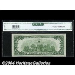 Fr. 2152-L $100 1934 Federal Reserve Note. CGA Choice Uncirculated 64.A nice near-Gem example that looks like it fully earned its third party grade. <BR><BR><B>Important notice:</B> Heritage usually auctions material at the rate of 200-250 lots per hour. On some occasions eBay Live bid software or the Internet may not be able to keep up with the pace of the auction. We recommend placing a realistic absentee bid now as insurance to avoid disappointment. Occasionally the auctioneer may eliminate or reject an eBay Live bid, and the auctioneer may also reopen a lot after the close of the eBay live bidding (usually because we missed an audience bid), and may reject your bid even if it shows you as the winning bidder. By bidding via eBay Live, you agree that Heritage may award the lot to another bidder at its sole discretion under the circumstances described above or any other reasonable circumstances. Since eBay bids are not shown to us until we open the lot on the floor, we treat those bids just like floor bids. In most cases the floor responds before the eBay bid is presented to us, due to Internet lag time, so for consistency we have made it a policy that floor bids are always considered first over tie eBay live bids. Also please note that all Heritage lots purchased through eBay Live carry a 20% Buyer's Premium. Please make sure you read the Terms and Conditions before you bid. <BR><BR><B>IMPORTANT ANNOUNCEMENT ABOUT RESERVES:</B> Heritage now divulges all reserves on its web site 7 days before every auction. If you want to know whether the reserve on this lot has been met, and if not, what the reserve amount is, please visit this lot page on the HeritageCoin.com web site, or email: bid@HeritageGalleries.com
