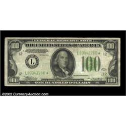 Fr. 2152-L* $100 1934 Federal Reserve Note. Extremely Fine.A nice example of this tougher star. Important notice: We expect to be auctioning lots at the rate of 200-250 per hour. Sometimes eBay Premier live bid software cannot keep up with that pace, so we strongly recommend that you place a realistic proxy bid now as insurance to avoid disappointment. Also please note that all Heritage/CAA lots purchased through eBay Premier carry a 20% Buyer's Premium. Please make sure you read the Terms and Conditions.