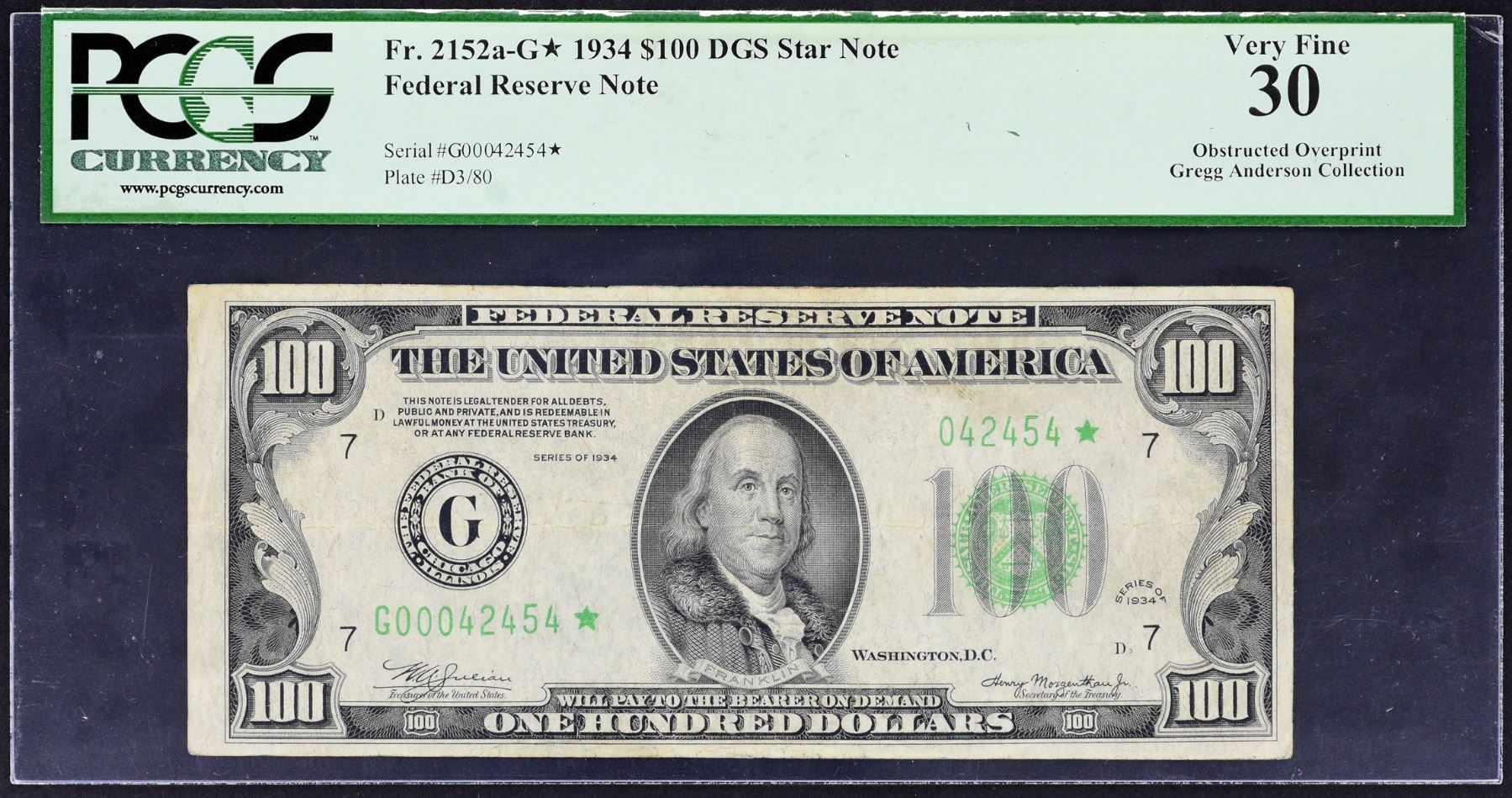 A landmark error note as it combines the utlra rarity of both an error and a replacement intended to fix such an issue. The note shows as intended in all regards, save for the right serial number which was obstructed during the third print. The error gives the note almost a large-size appearence at right without a prefix and only six serial numbers and star suffix. Just some honest circulation to mention and formerlly within the Gregg Anderson Collection.