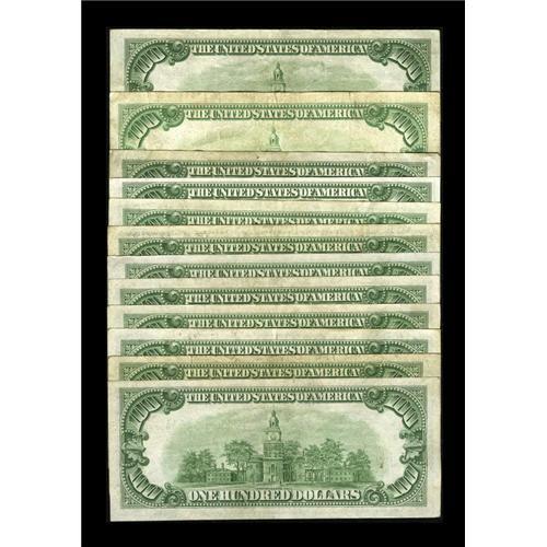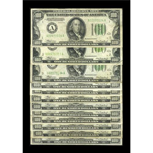 <B>Fr. 2153-A-L $100 1934A Federal Reserve Notes. Fine or Better.</B></I><BR>The New York note is of the Light Green Seal Variety. Of the other 11 notes, all are Mules except for the Atlanta $100. Each of the remaining ten notes sets a new low serial number for the 1934A Mules in the Schwartz reference. The Minneapolis $100 has several pinholes.<BR><BR><b>Shipping:</b> Coins & Currency (<a target="_blank" href="http://www.heritageauctions.com/common/shipping.php">view shipping information</a>)