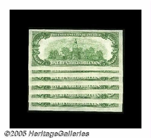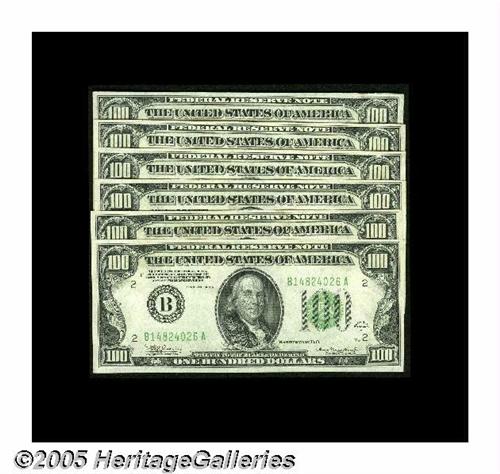 <B>Fr. 2153-B $100 1934A Federal Reserve Notes. Six Consecutive Examples. Choice Crisp Uncirculated.</B></I><BR>Embossing is found on this nicely preserved grouping.<BR>