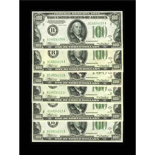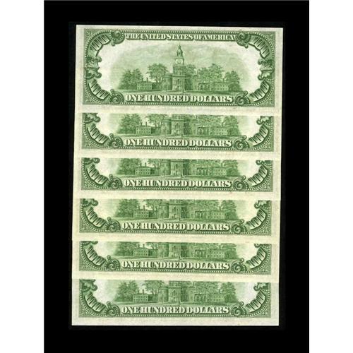 <B>Fr. 2153-B $100 1934A Mule Federal Reserve Notes. Cut Half Sheet of Six. Choice Crisp Uncirculated.</B></I><BR>A fresh and attractive run of six pieces making a cut half sheet. The Oakes catalogue value here is $325 per note in CU.