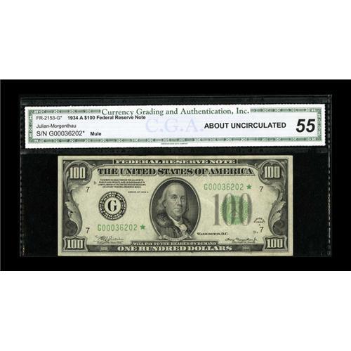<B>Fr. 2153-G* $100 1934A Mule Federal Reserve Note. CGA About Uncirculated 55.</B></I><BR>The colors remain bright on this once lightly folded example.<BR><BR><b>Shipping:</b> Coins & Currency (<a target="_blank" href="http://www.heritageauctions.com/common/shipping.php">view shipping information</a>)