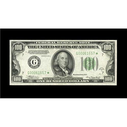 <B>Fr. 2153-G* $100 1934A Mule Federal Reserve Note. Choice Crisp Uncirculated.</B></I><BR>We average about one of these stars every two years in all of our auctions combined.<BR><I>From The Bill and Kathy Stella Currency Collection</B></I><BR><BR><b>Shipping:</b> Coin/Currency (<a target="_blank" href="http://www.heritageauctions.com/common/shipping.php">view shipping information</a>)