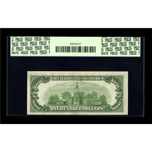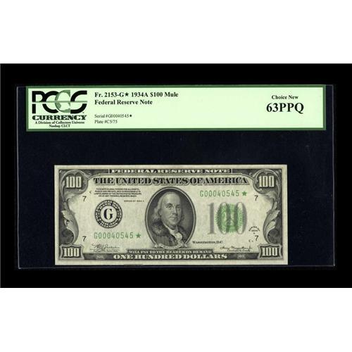 <B>Fr. 2153-G* $100 1934A Mule Federal Reserve Note. PCGS Choice New 63PPQ.</B></I><BR>This is only the third example in this grade we have offered at auction. With a touch better back centering this note certainly goes higher.<BR><BR><b>Shipping:</b> Coins & Currency (<a target="_blank" href="http://www.heritageauctions.com/common/shipping.php">view shipping information</a>)