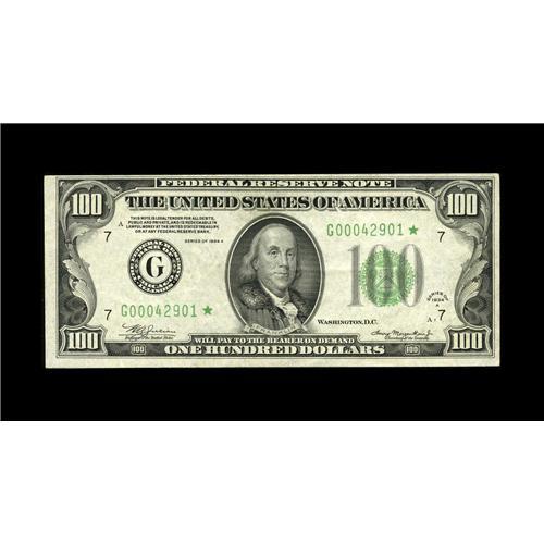 <B>Fr. 2153-G* $100 1934A Mule Federal Reserve Note. Extremely Fine-About Uncirculated.</B></I><BR>This is a new low serial number for the Oakes reference.<BR><I>From The Bill and Kathy Stella Currency Collection</B></I><BR><BR><b>Shipping:</b> Coin/Currency (<a target="_blank" href="http://www.heritageauctions.com/common/shipping.php">view shipping information</a>)