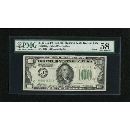 <B>Fr. 2153-J $100 1934A Mule Federal Reserve Note. PMG Choice About Unc 58.</B></I><BR> Micro Back Plate 74 is noticed on this lightly handled Kansas City example.<BR><BR><b>Shipping:</b> Coins & Currency (<a target="_blank" href="http://www.heritageauctions.com/common/shipping.php">view shipping information</a>)
