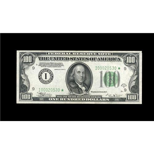 <B>Fr. 2154-I* $100 1934B Federal Reserve Note. Choice About Uncirculated.</B></I><BR>This Minneapolis star is an excessively rare note in any grade. While the printing figures are unavailable, the two serial numbers listed in the Oakes reference are less than 500 numbers apart. This piece, which is new to the collecting community, expands that range to barely over 1000 numbers. It's a well centered and very bright specimen which is oh so close to the full uncirculated grade. The Oakes catalogue lists values of $1000 in Very Fine condition and $5000 in CU. Expect this rarity to realize very near the higher figure, if it does not in fact exceed that number.