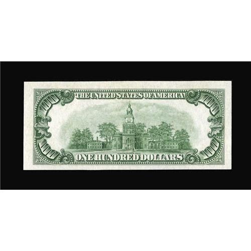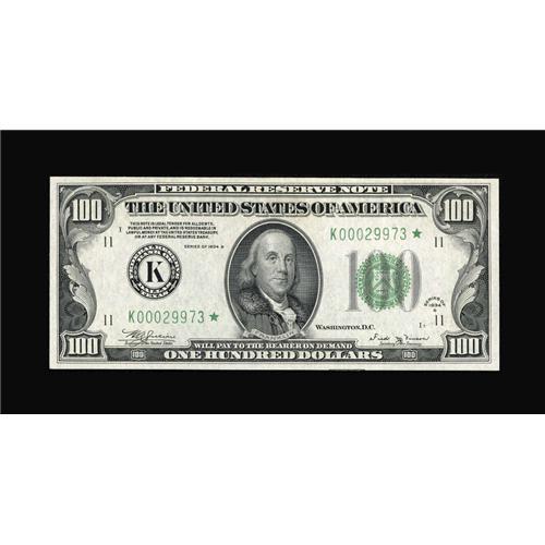<B>Fr. 2154-K* $100 1934B Federal Reserve Note. Choice Crisp Uncirculated.</B></I><BR>Over the last half decade, we have seen only three other examples of this issue. This deeply printed example is fully and evenly margined and appears Gem or better. There is however a touch of handling that precludes the grade, which will not discourage the collector of rare and desirable star notes.<BR><BR><b>Shipping:</b> Coins & Currency (<a target="_blank" href="http://www.heritageauctions.com/common/shipping.php">view shipping information</a>)
