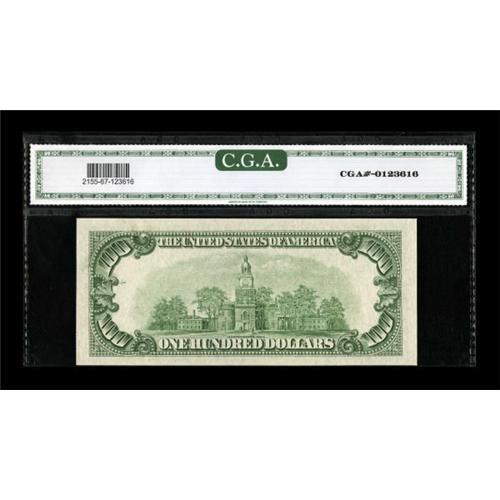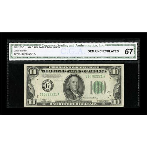 <B>Fr. 2155-C $100 1934C Federal Reserve Note. CGA Gem Uncirculated 67.</B></I><BR> Wide margins are noticed on this note which rarely is offered at auction in this state of preservation.<BR><BR><b>Shipping:</b> Coins & Currency (<a target="_blank" href="http://www.heritageauctions.com/common/shipping.php">view shipping information</a>)
