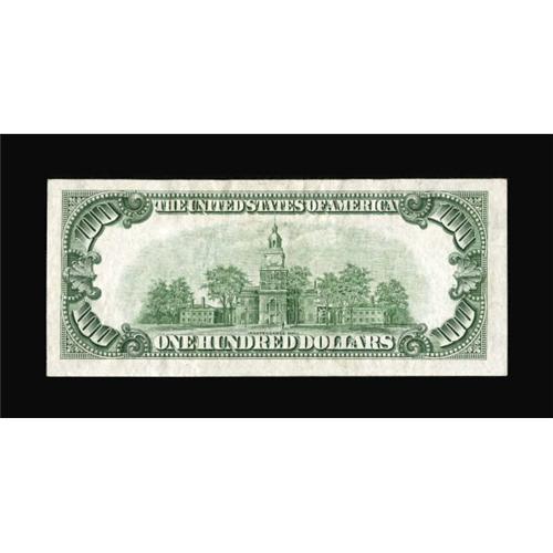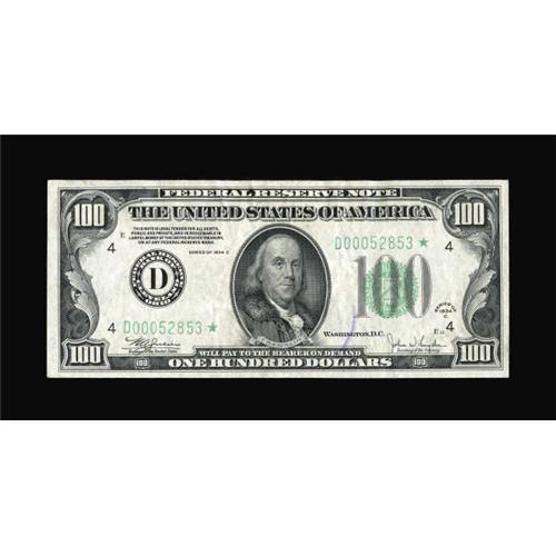 <B>Fr. 2155-D* $100 1934C Federal Reserve Note. About Uncirculated.</B></I><BR> An extremely rare star note which catalogues at $4500 in Choice CU in the new Schwartz and Lindquist reference. This bright and well centered example is very close to that grade. <BR><BR><b>Shipping:</b> Coins & Currency (<a target="_blank" href="http://www.heritageauctions.com/common/shipping.php">view shipping information</a>)