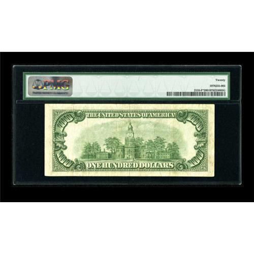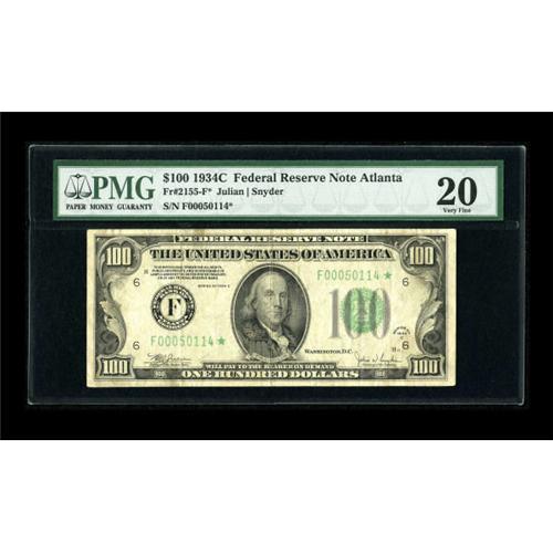 <B>Fr. 2155-F* $100 1934C Federal Reserve Note. PMG Very Fine 20.</B></I><BR> According to the newest Schwartz-Lindquist tome, this is the newly recorded low serial number for this scarce star issue. It is evenly circulated and problem free with a sufficiently bright overprint.<BR><BR><b>Shipping:</b> Coins & Currency (<a target="_blank" href="http://www.heritageauctions.com/common/shipping.php">view shipping information</a>)