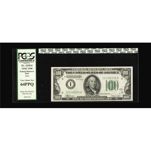 <B>Fr. 2155-I $100 1934C Mule Federal Reserve Note. PCGS Very Choice New 64PPQ.</B></I><BR>Minneapolis is definitely one of the more challenging districts to locate from this series.