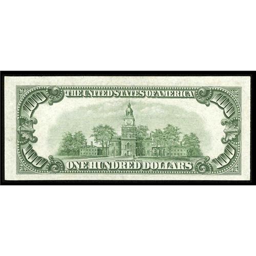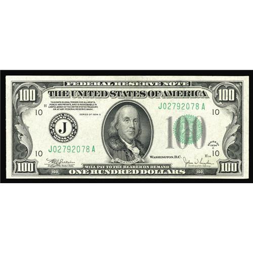 <B>Fr. 2155-J $100 1934C Mule Federal Reserve Note. Crisp Uncirculated.</B></I><BR>A little over 400,000 notes made up this print run for Kansas City. The note exhibits three spacious margins with a little tightness at the bottom.