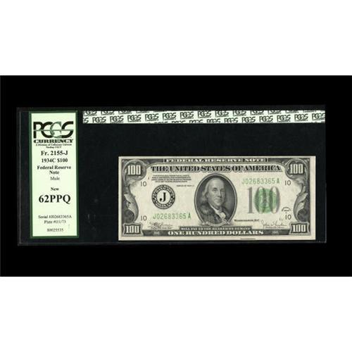 <B>Fr. 2155-J $100 1934C Mule Federal Reserve Note. PCGS New 62PPQ.</B></I> The top and right margins have prevented a higher grade.<BR><BR><b>Shipping:</b> Coins & Currency (<a target="_blank" href="http://www.heritageauctions.com/common/shipping.php">view shipping information</a>)