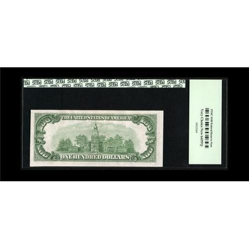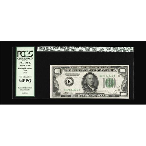 <B>Fr. 2155-K $100 1934C Federal Reserve Note. PCGS Very Choice New 64PPQ.</B></I><BR>A Mule from Dallas with superior color that would have been certified even higher but for a minor centering shift from left to right on the face.