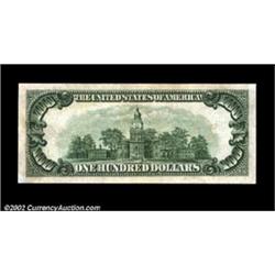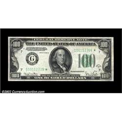 Fr. 2156-G* $100 1934D Federal Reserve Note. Choice Crisp Uncirculated.This is one of the greatest small size rarities that we have been privileged to offer in any of our thirty-one sales. Only a literal handful of 1934D $100 star notes are known from all districts combined, and we have neither seen nor heard of any in this grade range before this example surfaced. The last 1934D $100 star offered at auction was considerably lower grade and brought well into five figures, and a very well circulated and not terribly pretty Chicago district example realized almost $7,000 in a 2001 sale. If rarity and desirability are any guide, expect this extraordinary item to easily reach and likely exceed... Important notice: We expect to be auctioning lots at the rate of 200-250 per hour. Sometimes eBay Premier live bid software cannot keep up with that pace, so we strongly recommend that you place a realistic proxy bid now as insurance to avoid disappointment. Also please note that all Heritage/CAA lots purchased through eBay Premier carry a 20% Buyer's Premium. Please make sure you read the Terms and Conditions.